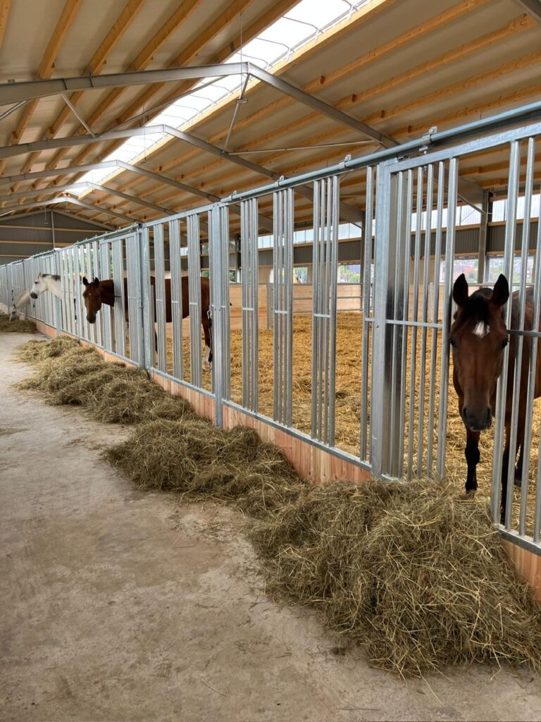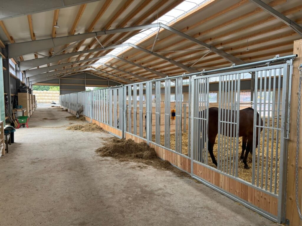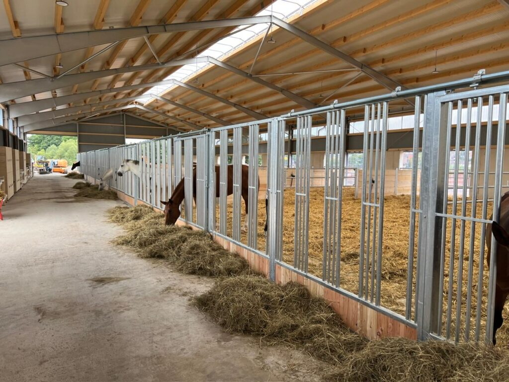 Diese schönen großzügigen Pferdeboxen sind speziell auf die Bedürfnisse moderner, pferdegerechter Haltungskonzepte ausgelegt. Die offene und stabile Bauweise fördert den Sozialkontakt zwischen den Pferden und trägt zu einem ruhigen, stressarmen Stallklima bei.