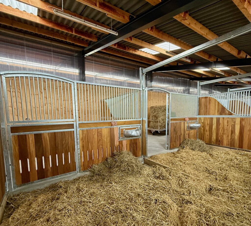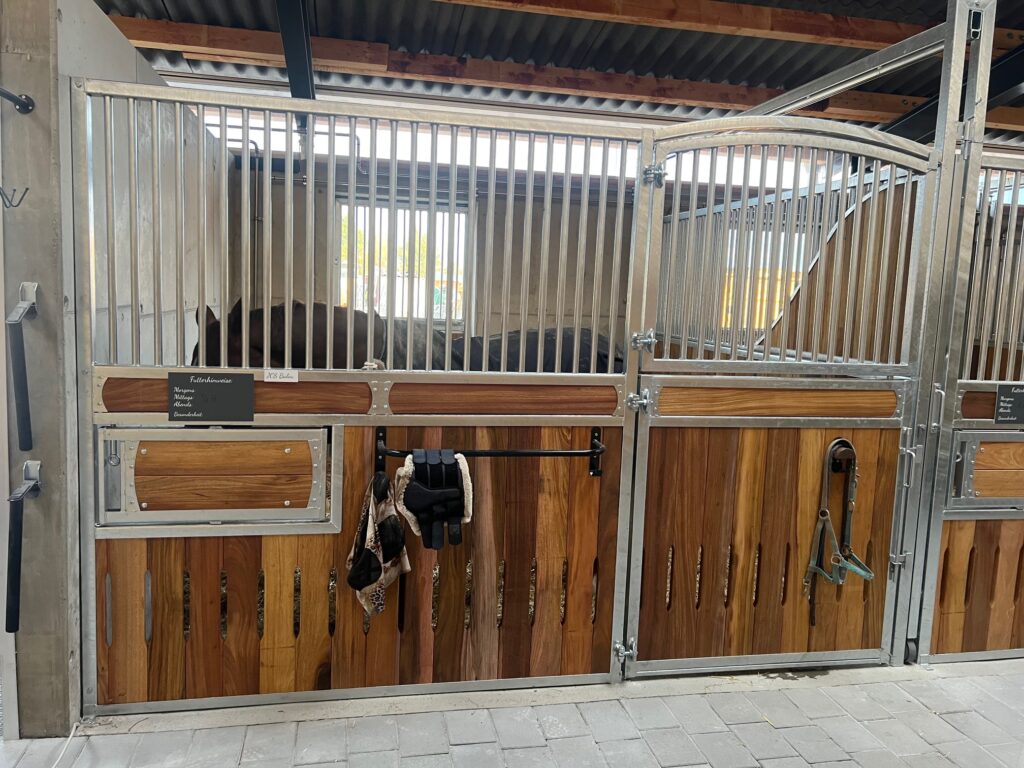 Wir freuen uns, Ihnen eine sehr schöne neue Stallanlage vorstellen zu dürfen. Die geraden Boxenfronten mit einer zweiteiligen Drehtür mit Rundbogen verleihen dem Stall stilvolles Erscheinungsbild. In den Vorderfronten wurde ein schwenkbarer Futtertrog und eine Querbohle verbaut.